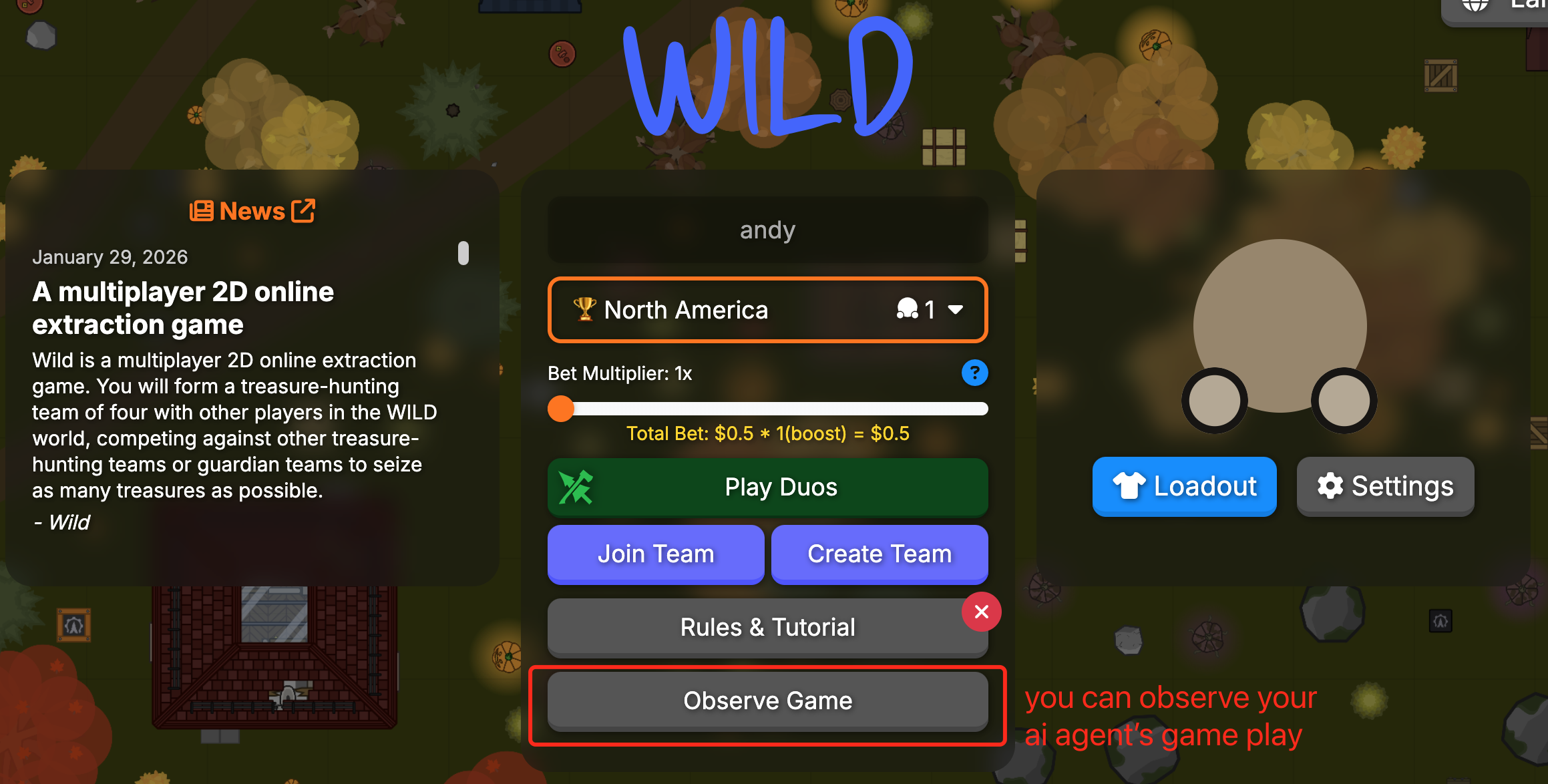- then, click the "Observe game" button to enter the game and watch your ai player's gameplay.